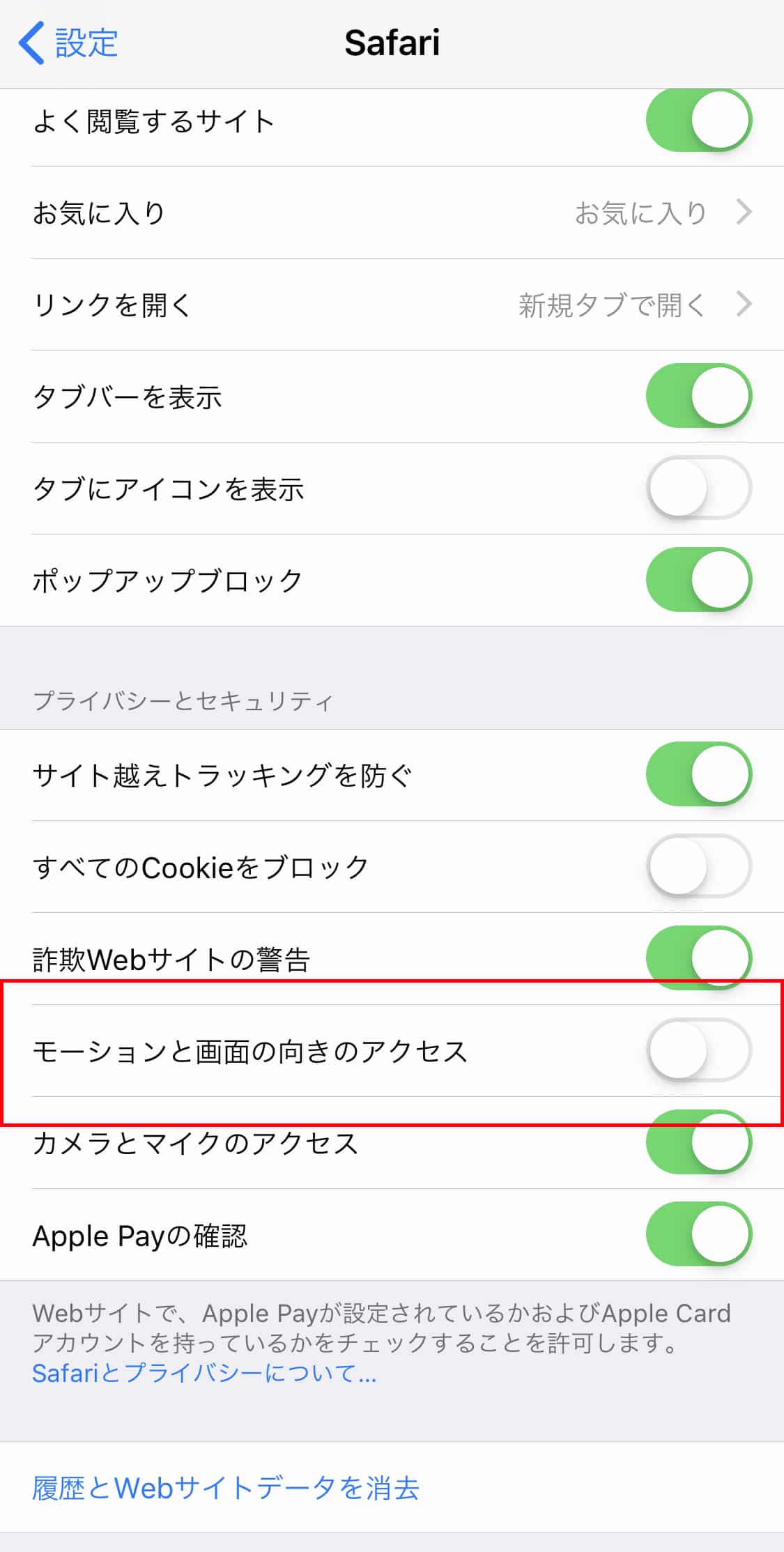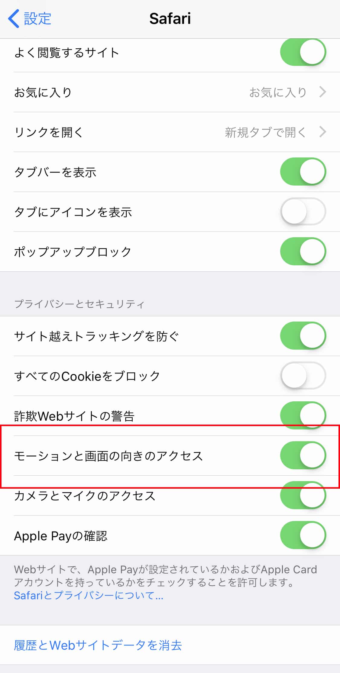 ②”プライバシーとセキュリティ”の“モーションと画面の向きのアクセス”をONに